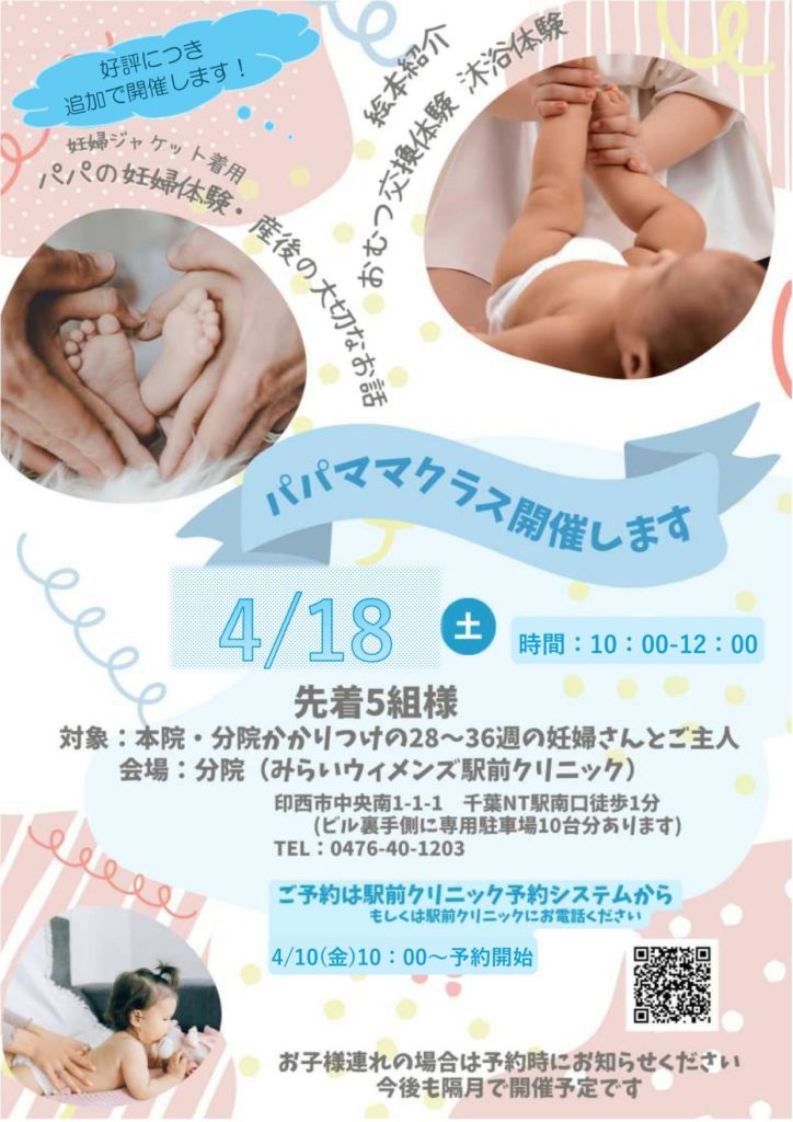【駅前クリニック】4/18(土)AMパパママクラス追加で開催!(4/10予約開始)2026/03/31
